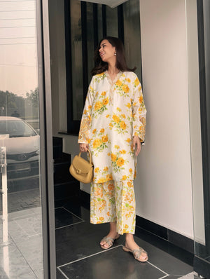 This breezy sunflowers on off white base pure raw silk shirt has embroidered neckline and sleeves and paired with printed culottes .