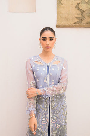 Fiya creating a nod to modern glamour and burst of metallic silver marine themed work on a beautiful lavender blue organza jacket. This stunning jacket has been paired up with a wide legged velvet sharer pants and a under top.