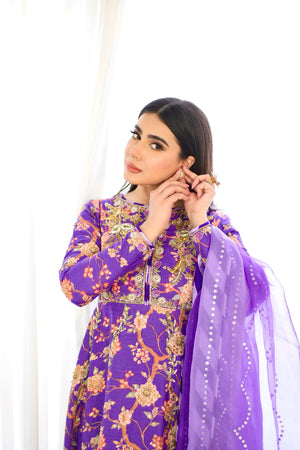 This floral printed pishwas has heavily hand worked with mukaish,resham and zardozi all over the pishwas. We have paired this with pure organza Kamdani worked two tone dupatta and straight pants.