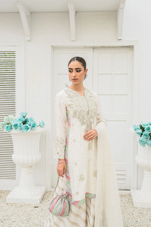 Rania white is the favourite one all made with love. A blend of traditional silver dabka naqshi GOTA and Sheesha work on neckline and motives on front is used with flawless techniques, the side seam and hemline is done with pastel hues of chattapatti which creates more power to the ensemble. Bringing the sexy back with a traditional way a round sheesha worked back cut tying up with ombre organza. We have paired this with a fused silver block painted sharara and intricate applique worked organza dupatta.
