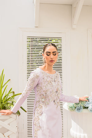 Zuria is a modern silhouette with 3d A-symmetrical embellishments of sequince,zardozi,crystals and Swarovski work on a lilac fused raw silk one side slit gown. To maximise the elegance of the outfit we created a sassy details and back.