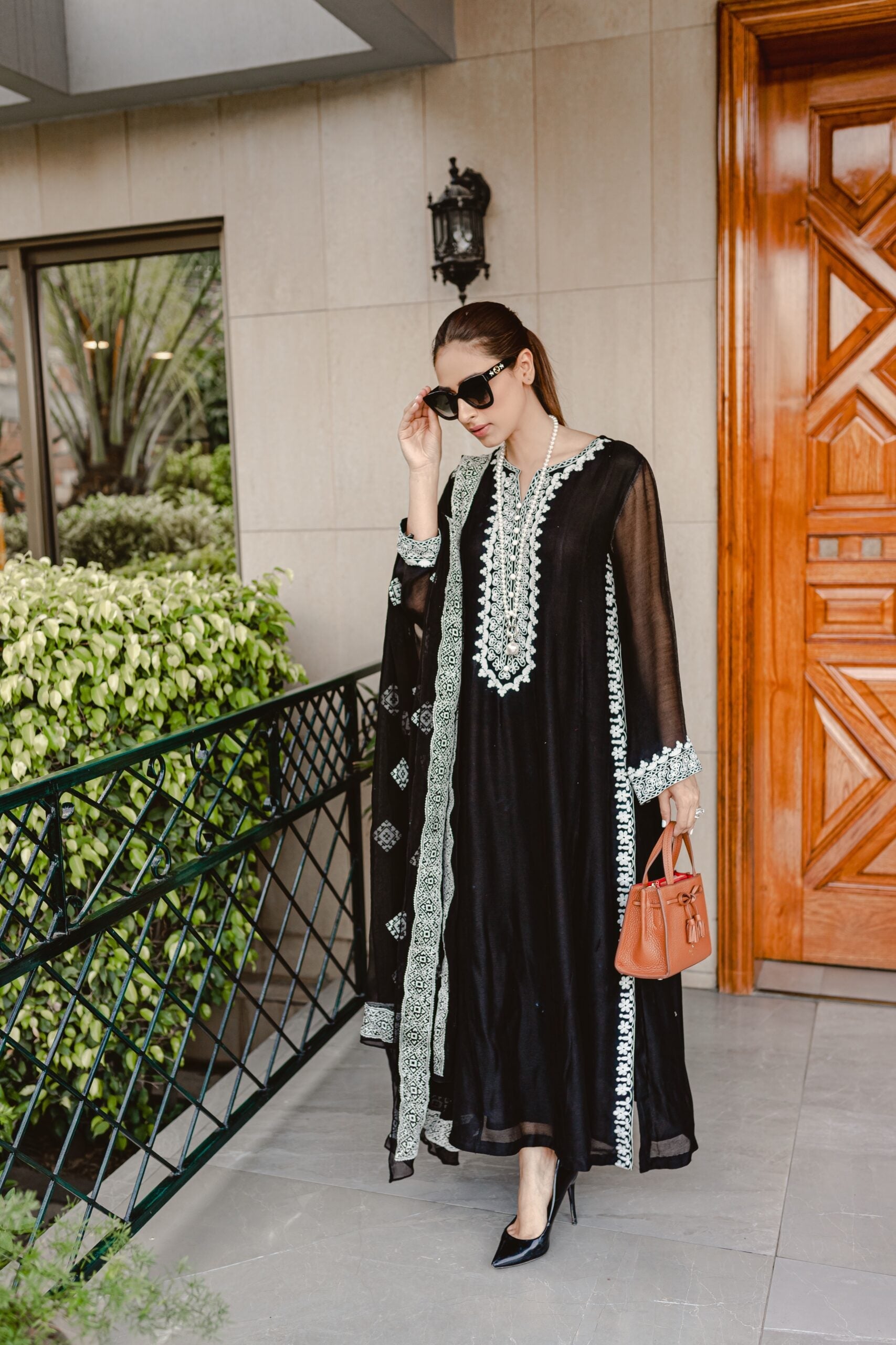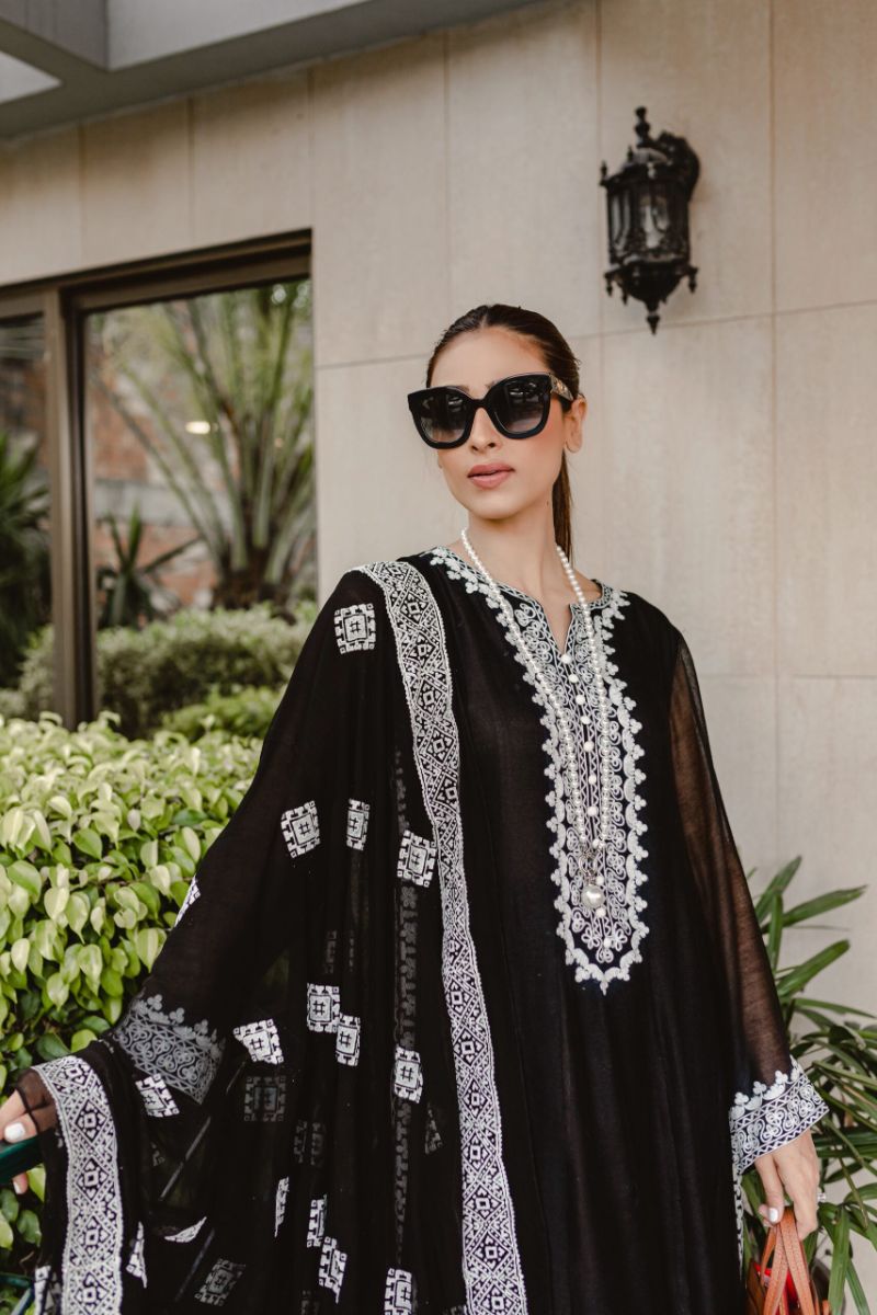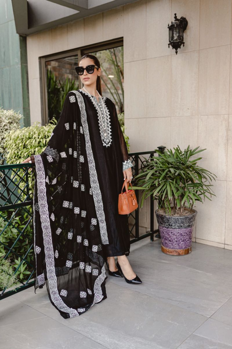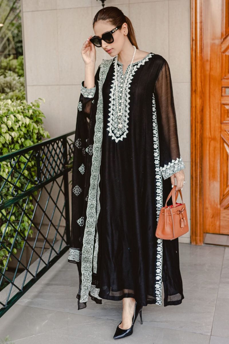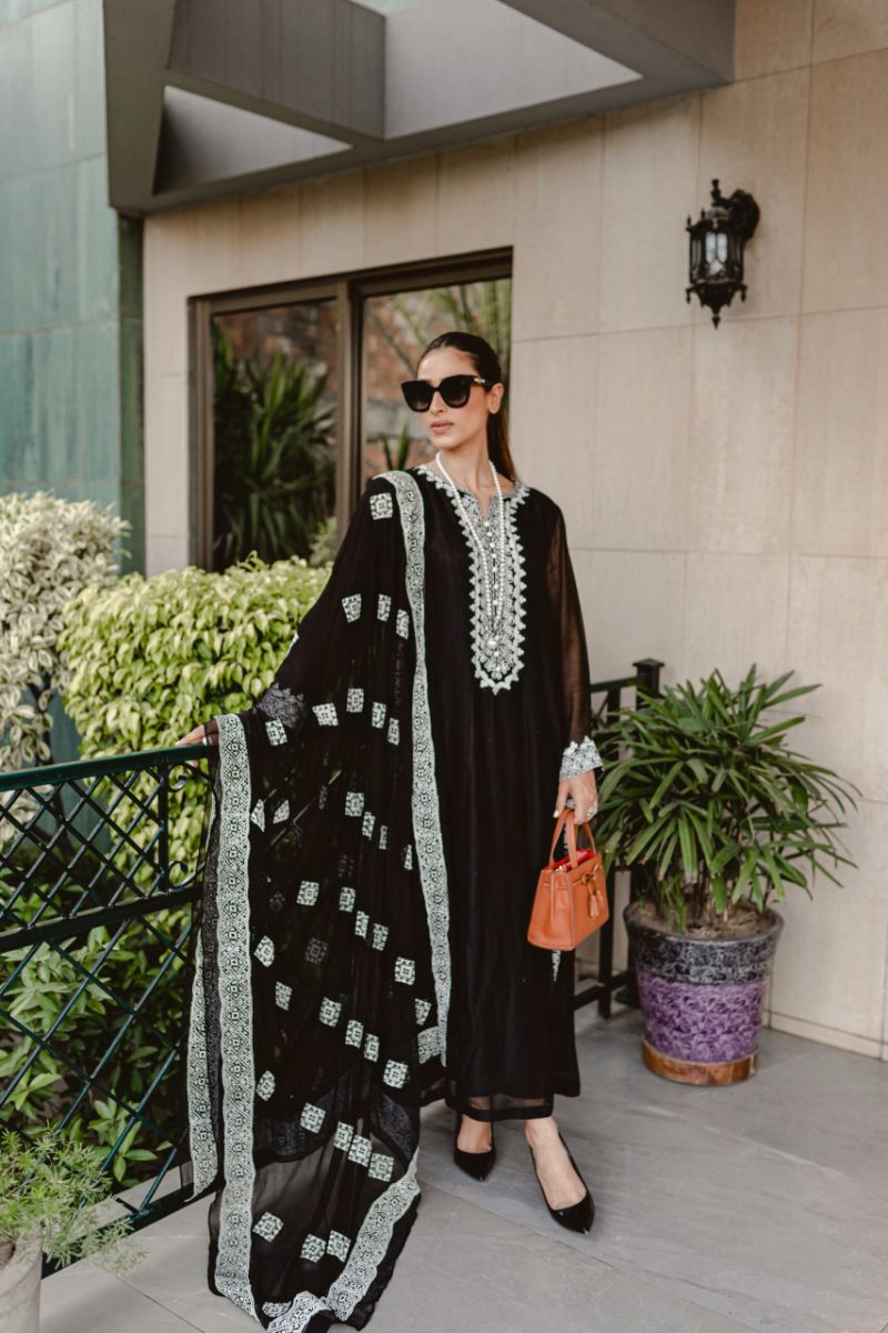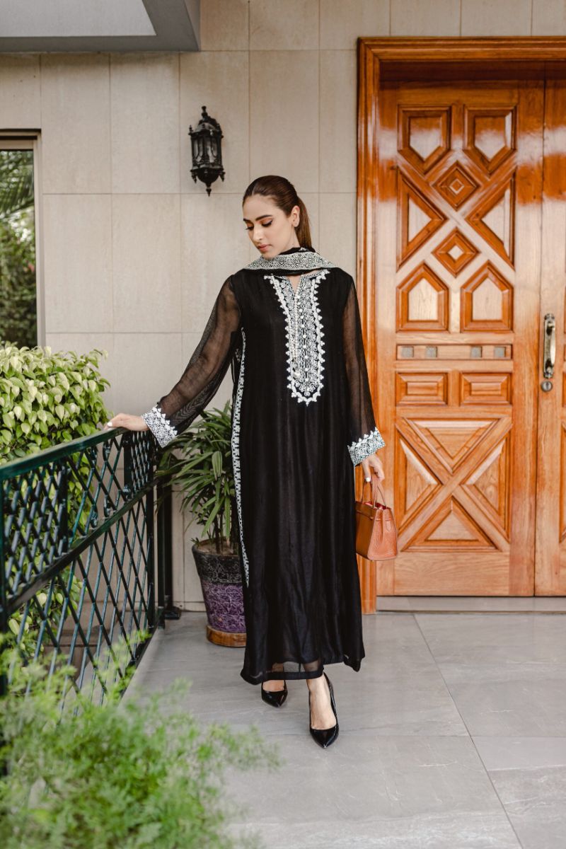 This beautiful black silk cotton net panelled shirt has intricate white Aari embroidery on neck,sleeves and side seam with long slits. We have paired this outfit with black chiffon dupatta with all over white emboss paint and straight black pants.