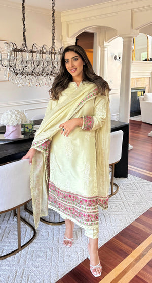 This sleek long off white Korean rawsilk shirt has embroidered with self Kashmiri stitch motives all over, with multi Kashmiri embroidered borders on bottom and the neck is handworked with pearls and Swarovskis. The dupatta has all over embroidered organza borders edged with laces and paired with straight pants.