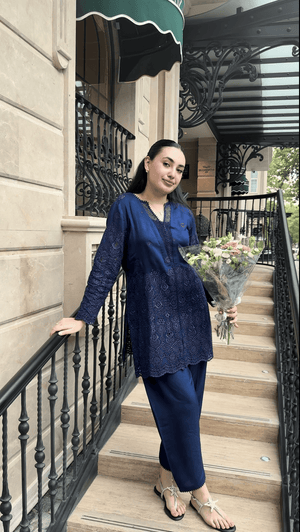 This pure cotton net schiffli embroidered cord has lace edgings and paired with skinny shalwar