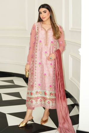 This pretty pink Raw Silk digital printed shirt has delicate resham zardozi hand worked neckline, embroidered chiffon sleeves paired with straight pants and cotton net dupatta