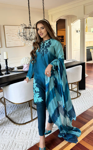 This chick mid length teal ombré toned shirt has silk applique work on side slits neck and sleeves. We have paired it with straight pants and two toned scalloped dupatta.