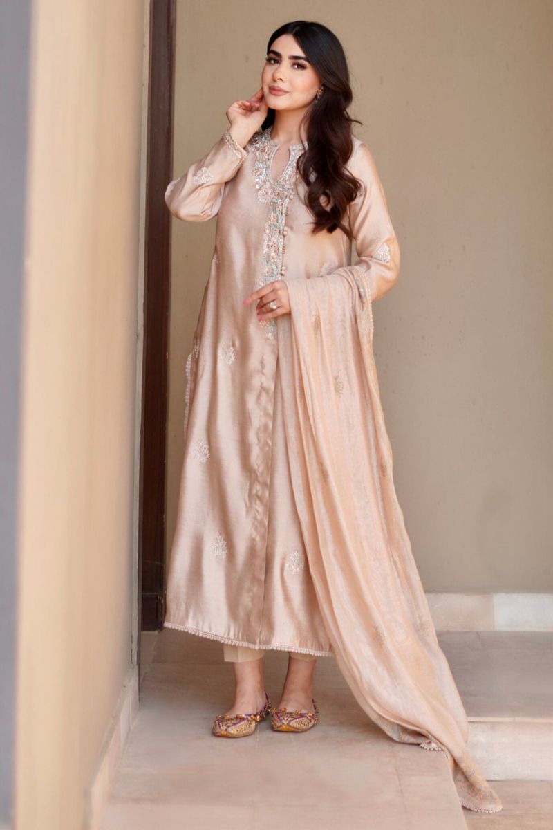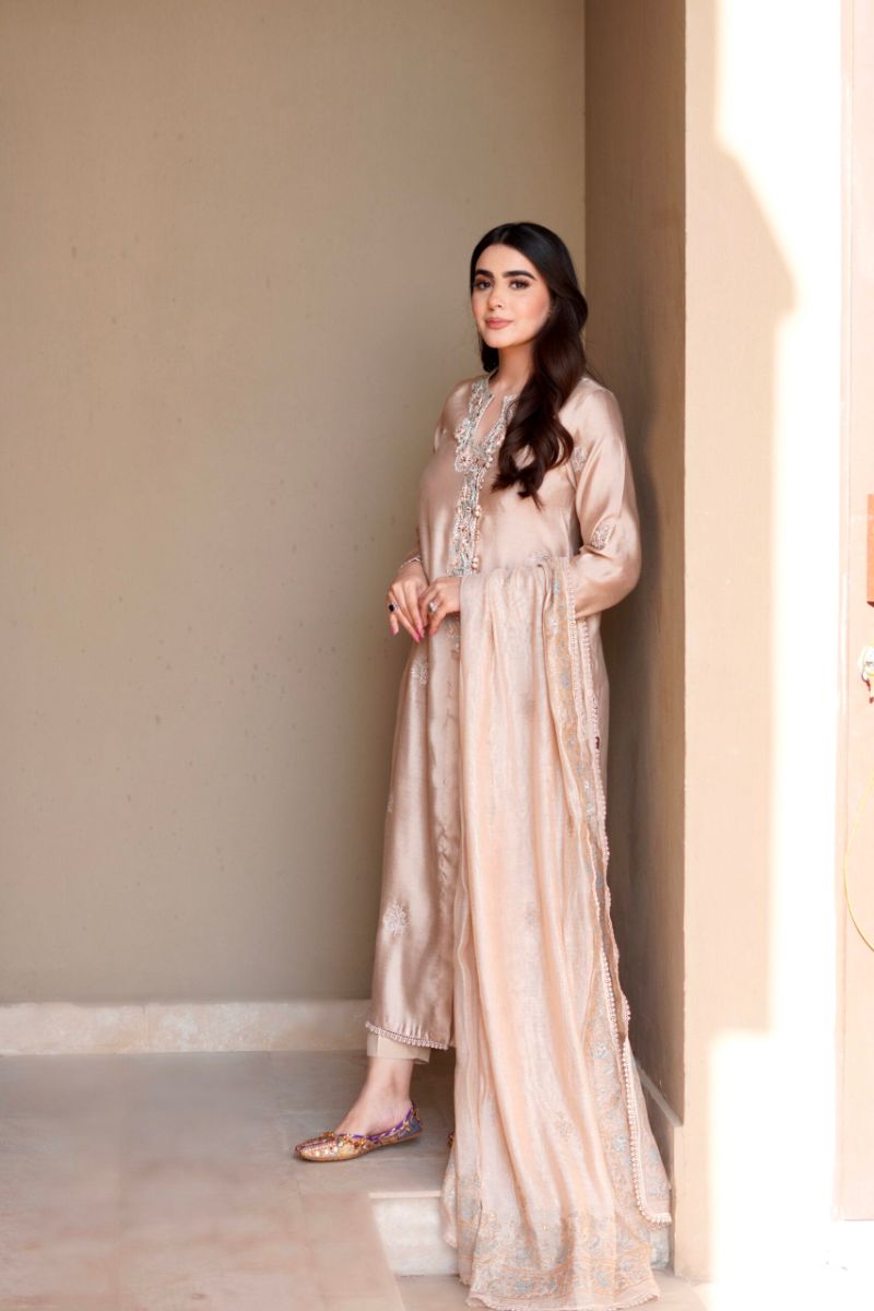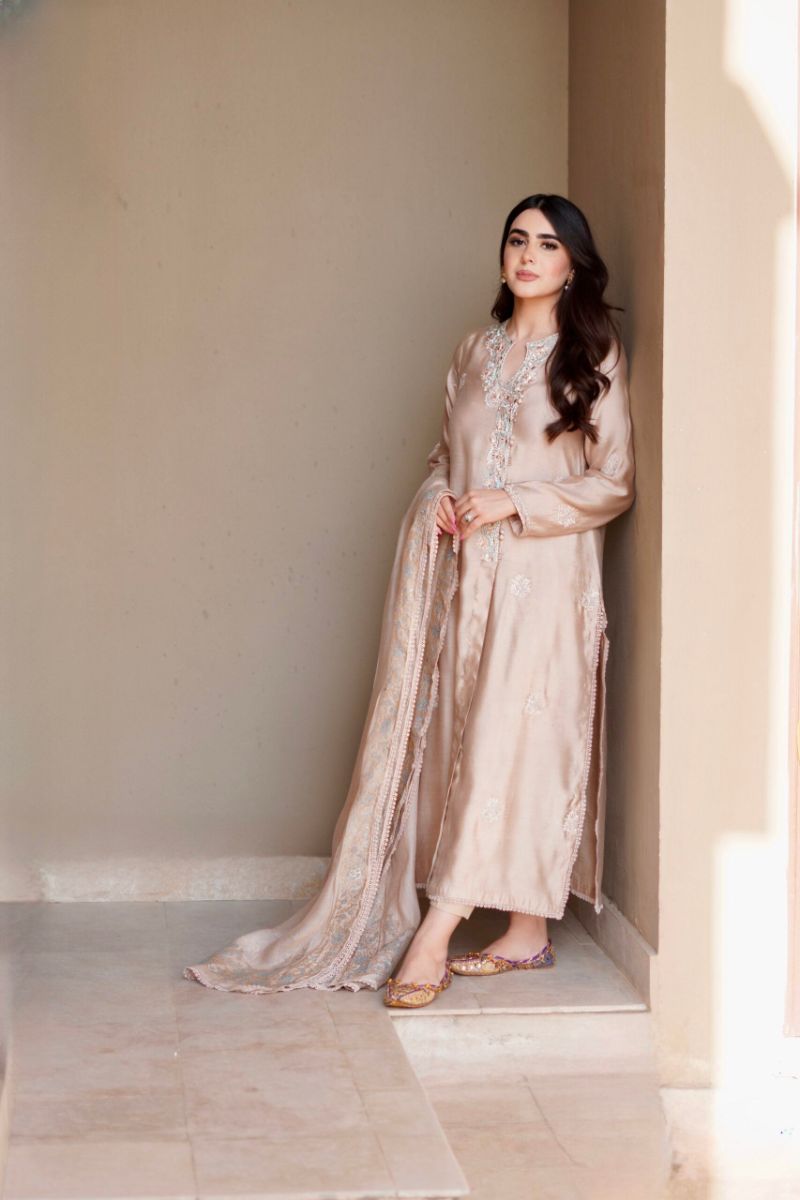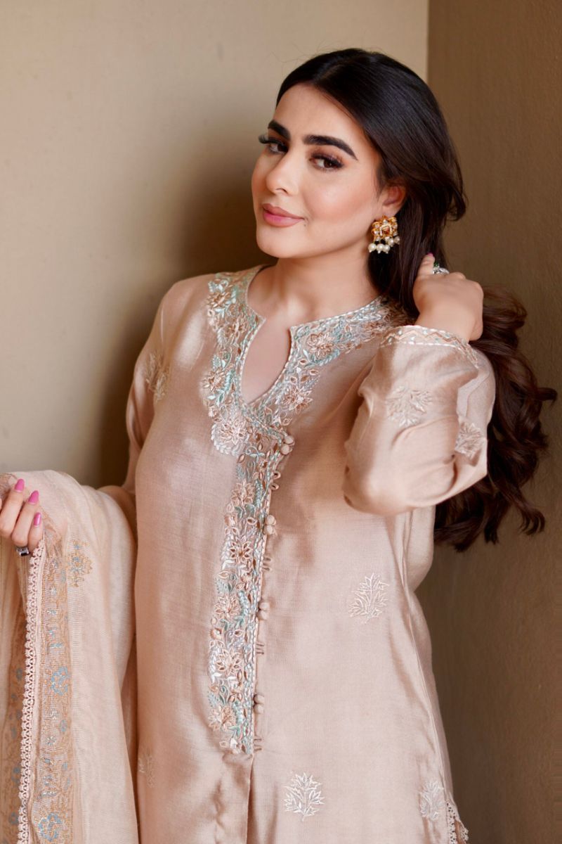 This pure cotton net nude skin angrakha cut has beautiful aqua kacha tanka embroidery on neckline and self zari motives spray all over, we have paired this sleek cut with straight pants and silk cotton net block printed dupatta.