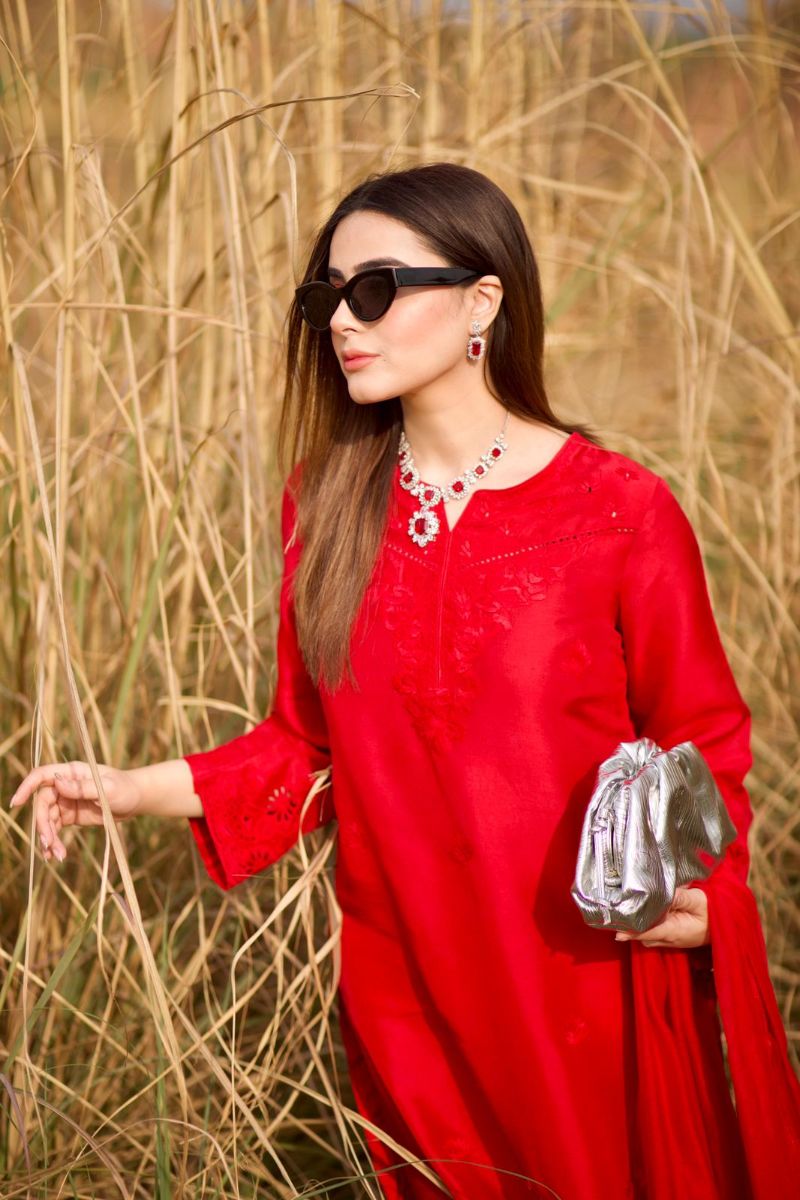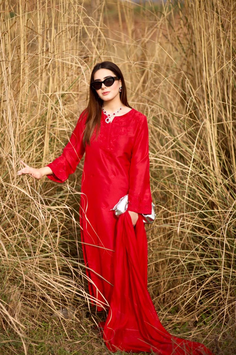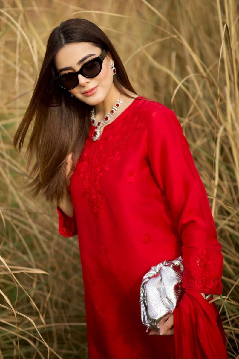 The vibrant cherry red rawsilk shirt has anchor thread and resham thread red on red embroidery on neckline,cutwork embroidered cuffs and all over booti work on shirt front. we have paired this long shirt with straight pants and cotton net dupatta.