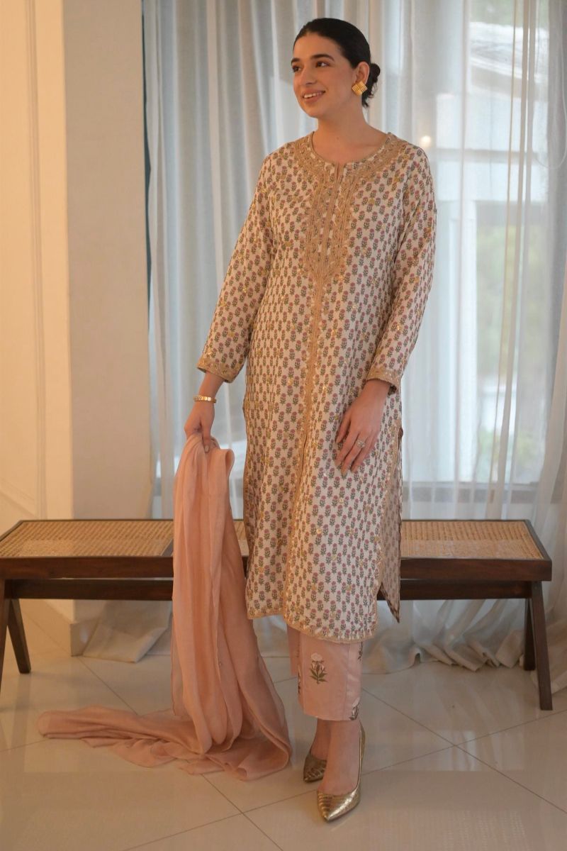 A refined nude-skin printed ensemble crafted in luxurious silk, the Sabrina Set features a delicately hand worked neckline finished with intricate lace detailing. Paired with a soft cotton net dupatta and straight-cut trousers, this look blends elegance with effortless sophistication, perfect for timeless festive...
