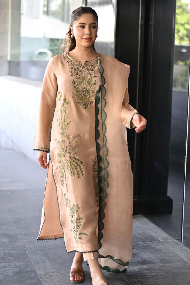 The beautiful caramel beige pure rawsilk shirt has garden greens embroidery on it and a sleeker long cut paired with straight pants and organza dupatta which has green appliqué scalloped on the borders.