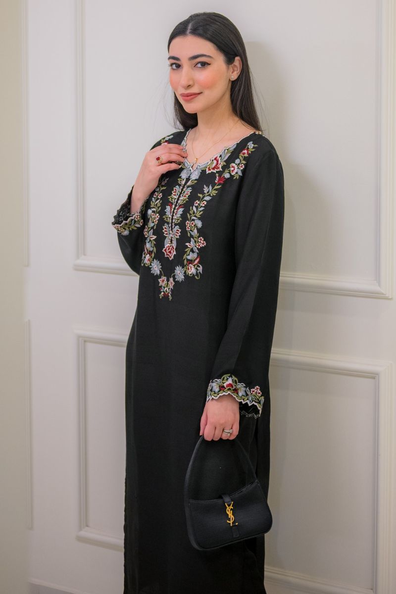 This pure black rawsilk shirt has floral embroidered front and back neckline, paired with straight pants And cotton net embroidered silk apllique pallu work on dupatta enhances the look