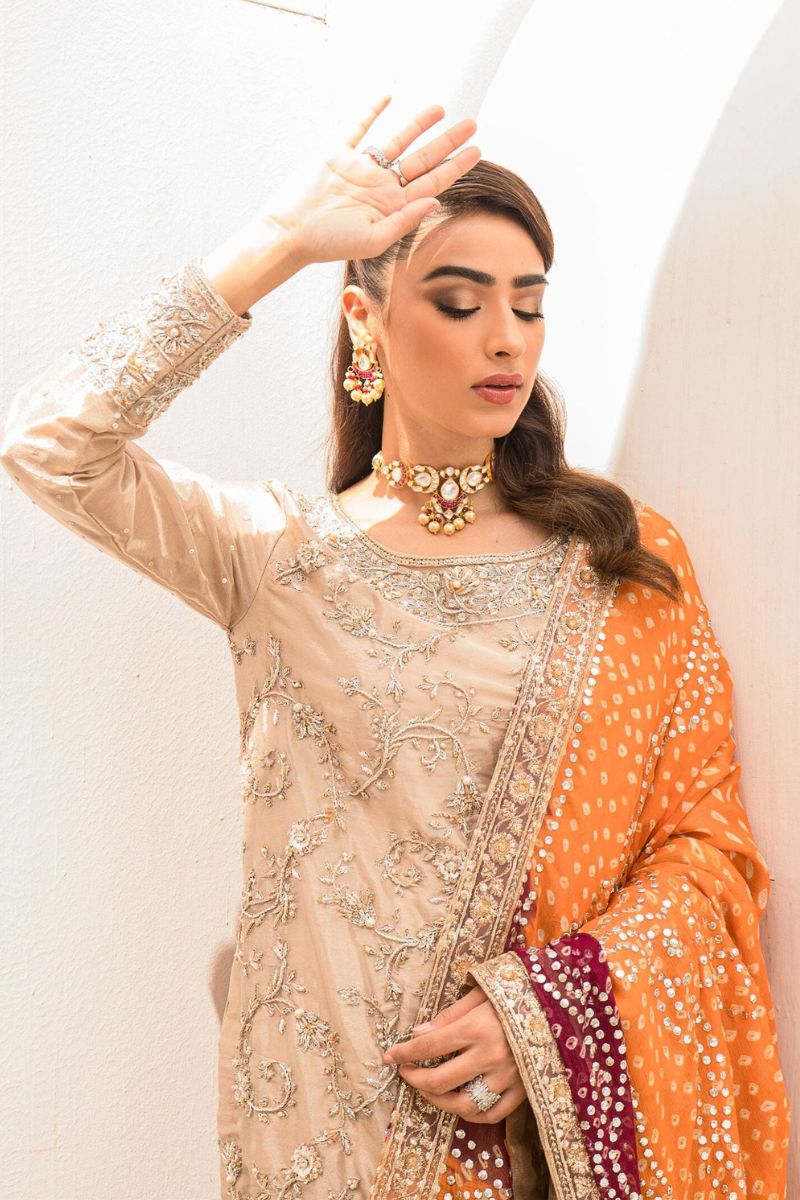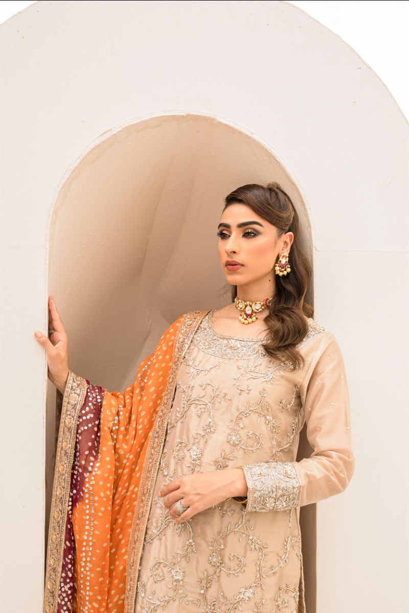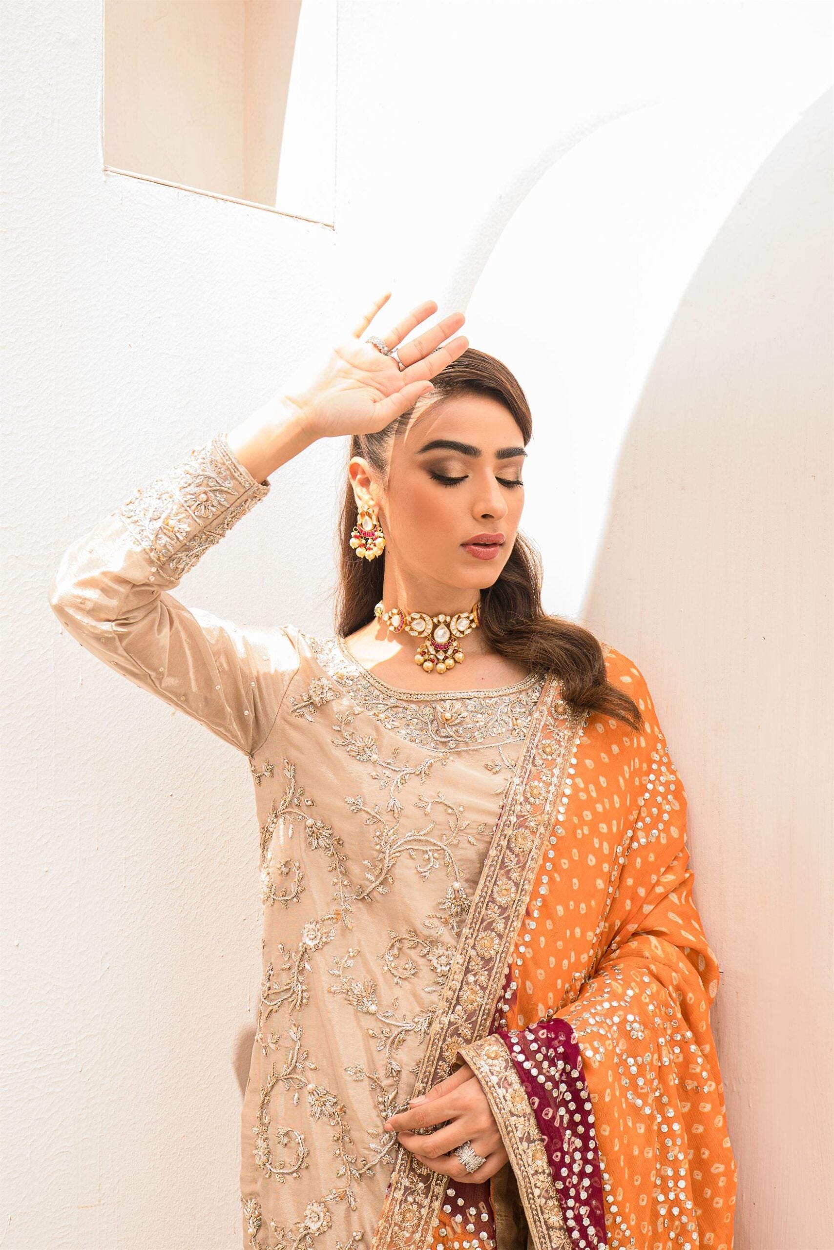 Norah is a beautiful flattering sleek cut with side slits, easy to wear for every body type outfit. A burst of silver with gold on a gold tissue shirt paired with a heritage chunari kamdani chaddar with a hint of maroon and rust to pop up the outfit.