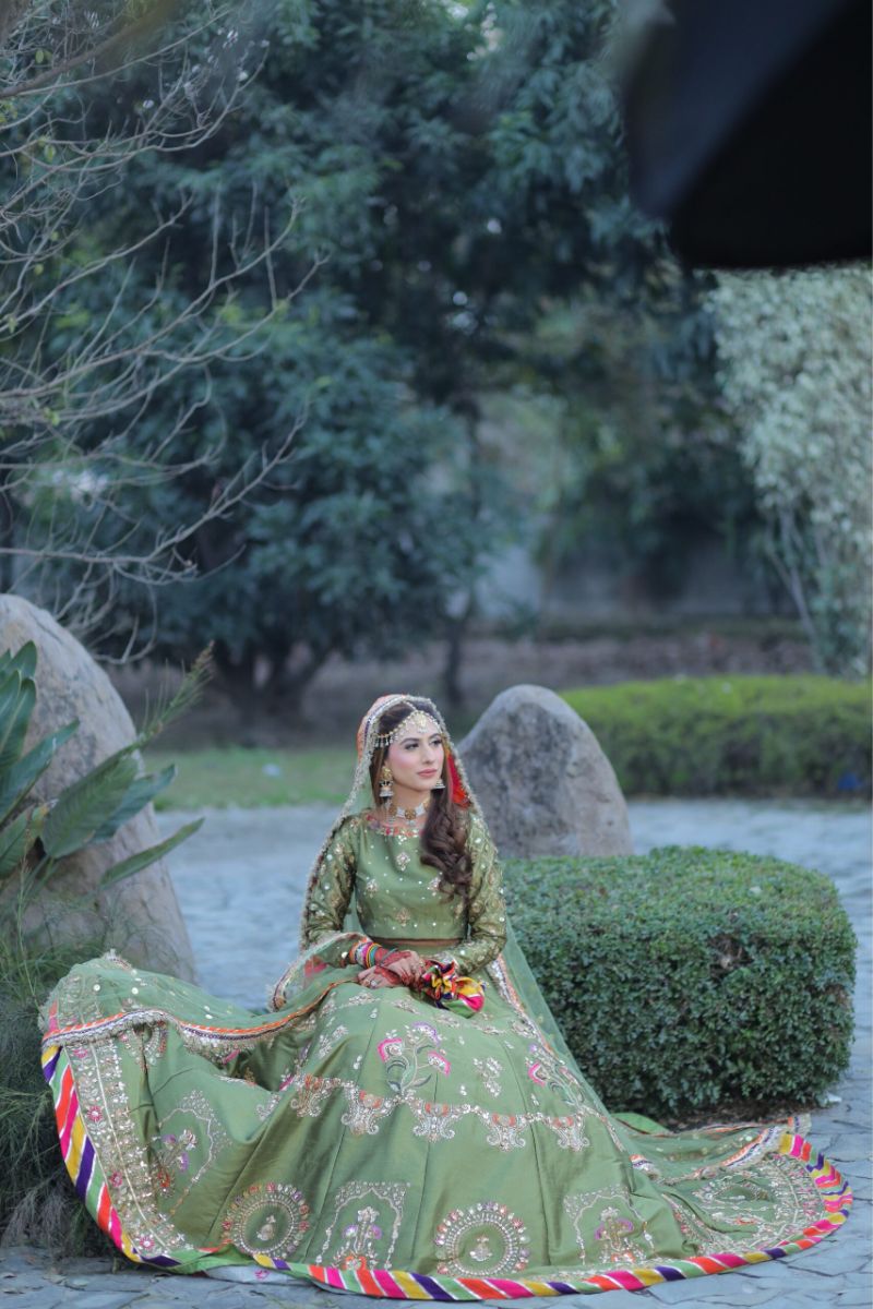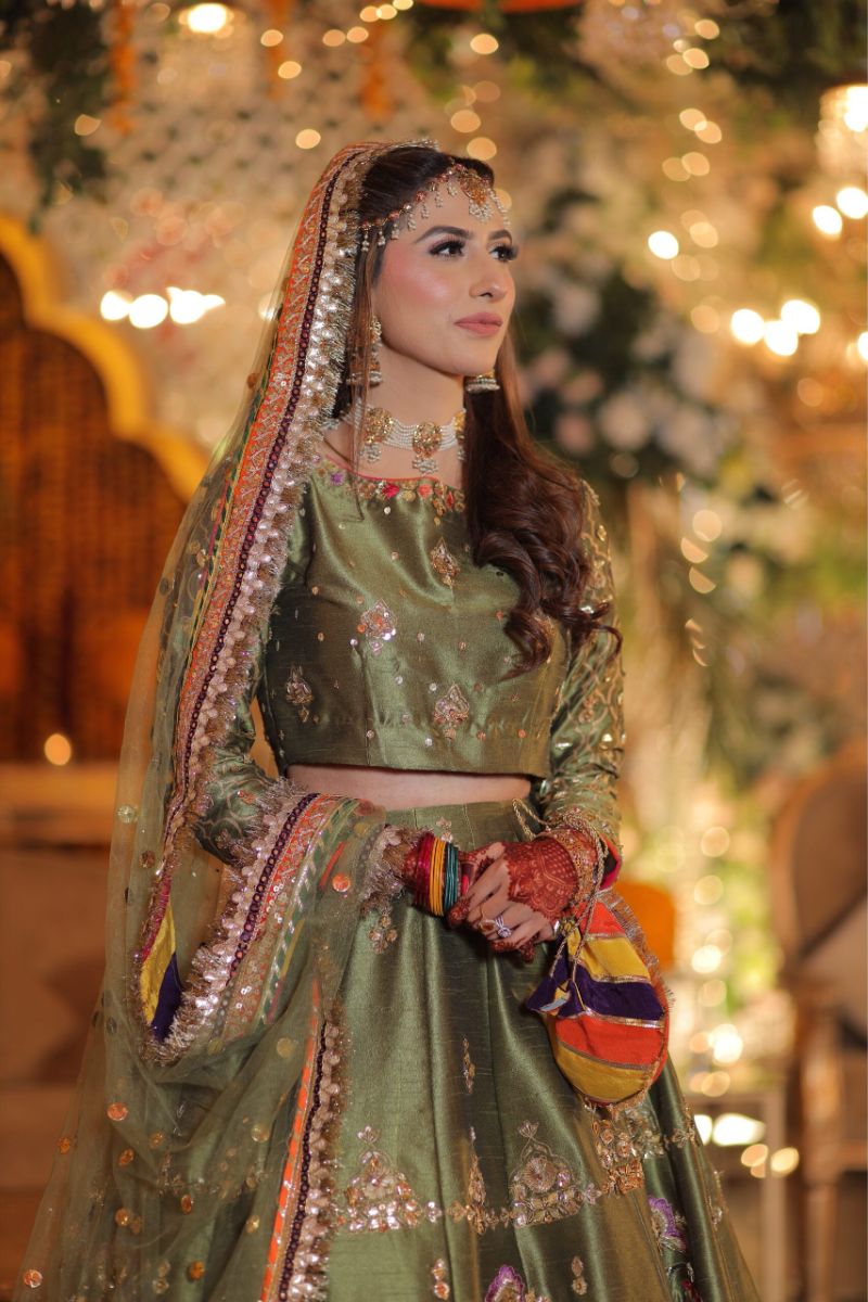 Mahnoor looks Regal in our custom handcrafted mehindi bridal. The lehenga is crafted on raw silk with royal gold block printing technique mixed with gota and resham work. It’s fine finished with silk chatta patti technique, paired with Mukaish net dupatta and gota laces. Hues bridals are made with all love and efforts to achieve the dream look of our bride. 💕