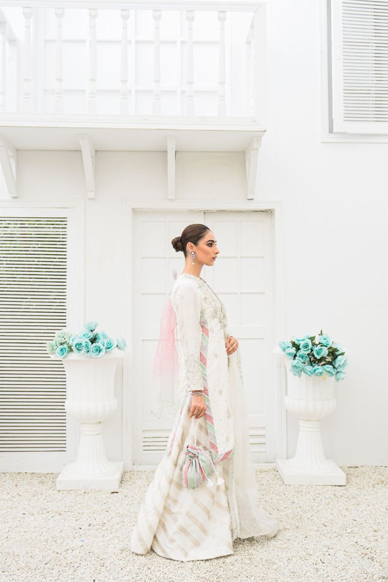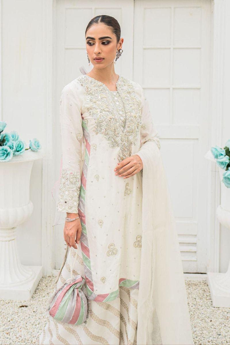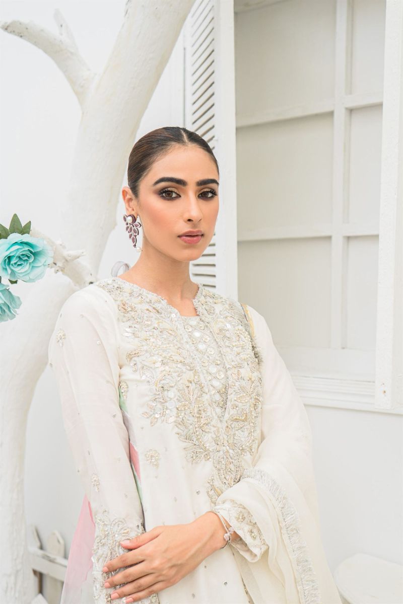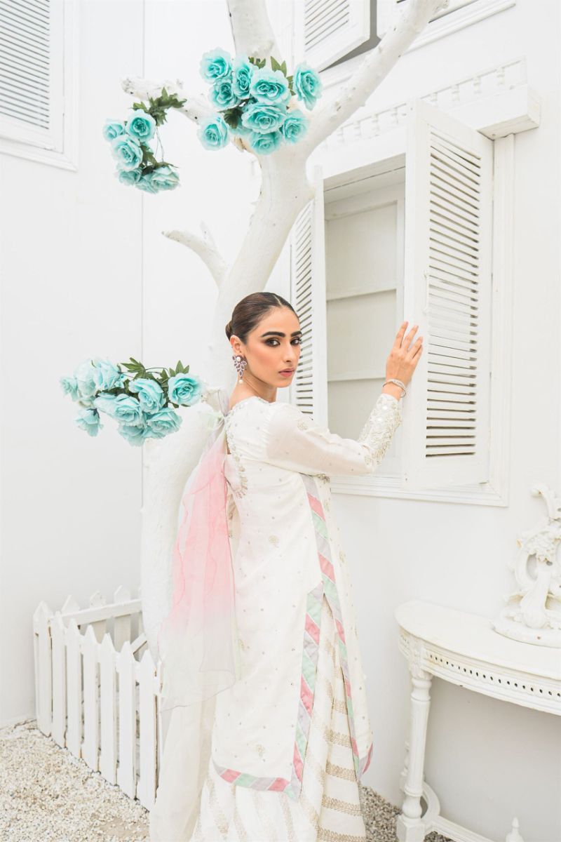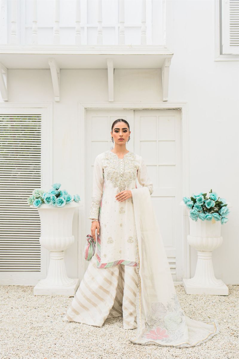 Rania white is the favourite one all made with love. A blend of traditional silver dabka naqshi GOTA and Sheesha work on neckline and motives on front is used with flawless techniques, the side seam and hemline is done with pastel hues of chattapatti which creates more power to the ensemble. Bringing the sexy back with a traditional way a round sheesha worked back cut tying up with ombre organza. We have paired this with a fused silver block painted sharara and intricate applique worked organza dupatta.