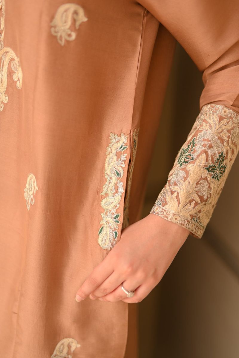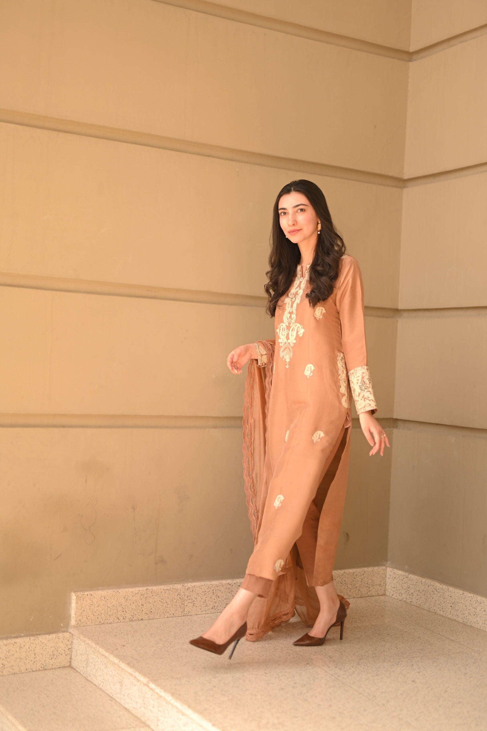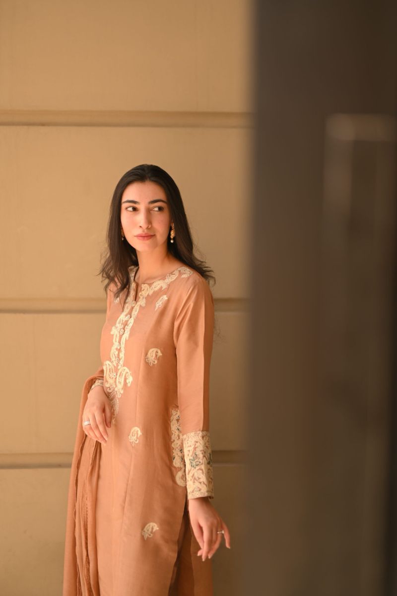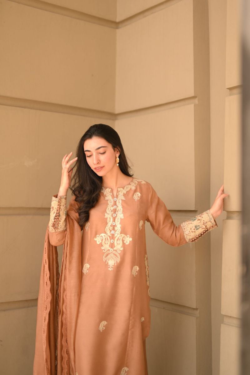 @aminasultan__ looks chic and classy in our beautiful sugar brown outfit which is made on pure rawsilk with all aar embroidery details in offwhite,zari and tint of emerald green. We have paired this one with straight pants and cotton net dupatta.